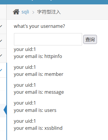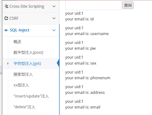 字符型注入,目标:获取当前数据库中的users表中的所有用户名及其他感兴趣的信息。