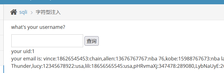 字符型注入,目标:获取当前数据库中的所有用户名及其他感兴趣的信息。
