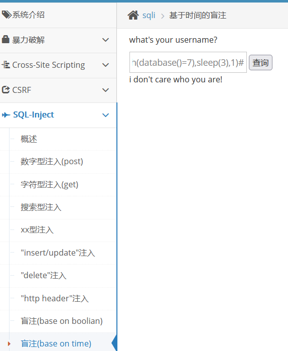 同样,也是写脚本,通过返回的时间长短判断,可使用sqlmap。