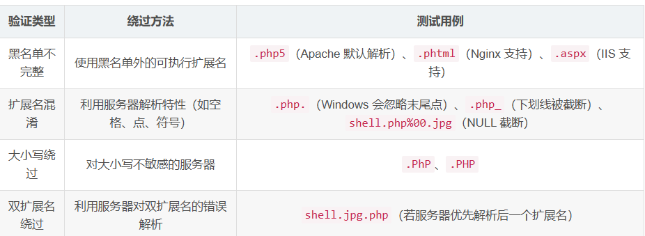 原理:后端通过黑名单 / 白名单限制扩展名,但规则存在缺陷。